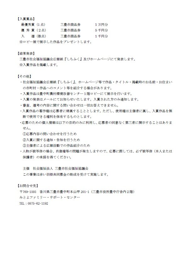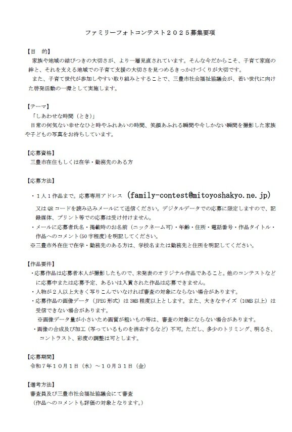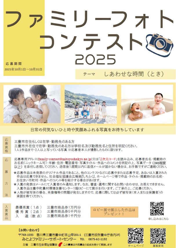 ファミリーフォトコンテスト2025のお知らせ 2025年09月30日 | お知らせ 今年もファミリーフォトコンテスト2025を開催します。 たくさんのご応募お待ちしています。 昨年のファミリーフォトコンテスト2024入賞作品はこちら facebook twitter line