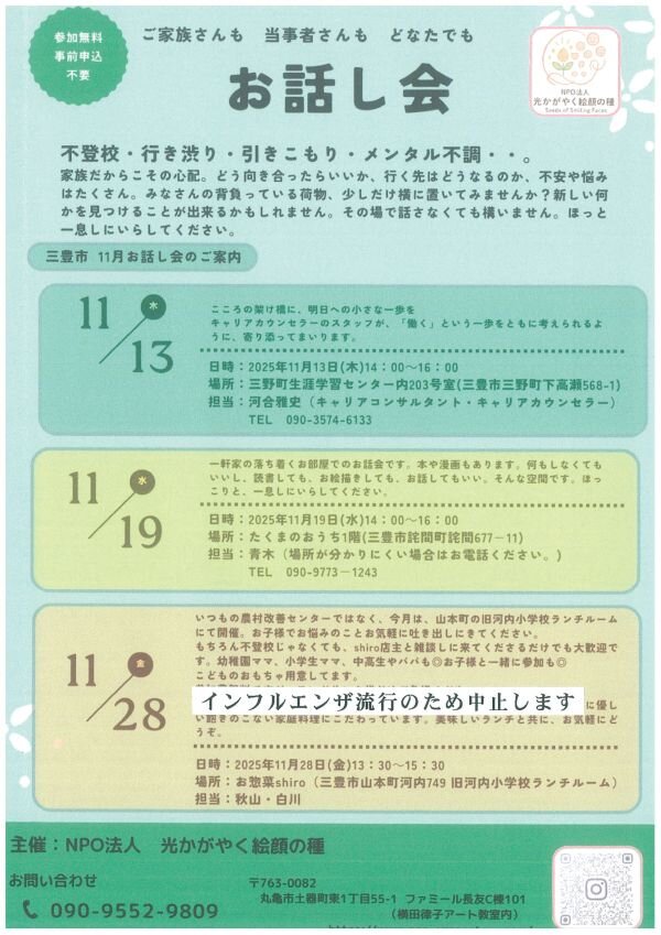 【NPO法人光かがやく絵顔の種】イベント中止について(11/28) 2025年11月26日 | お知らせ 11/28(日)NPO法人 光かがやく絵顔の種 が開催を予定しておりました、イベント(開催場所:お惣菜shiro)については、インフルエンザ流行中のため中止となりました。 facebook twitter line 最近の記事 【ニオノチルビレッジ】子育てアップデートおしゃべり会について(12/9~3/10) 【NPO法人光かがやく絵顔の種】イベント中止について(11/28) 2026年度カゴメみらいやさい財団助成事業について ファミリーマート&むすびえ 2025年度 こども食堂スタート応援助成プログラム冬期スタートプラン募集について 公益社団法人セカンドハンド 2025年度子ども食堂助成金の募集について キューピーみらいたまご財団「2026年度 第Ⅰ期 助成事業募集」について ツルハグループ「こども食堂ゆたかさ基金」2026年度春期助成 募集開始について 令和7年度 赤い羽根「篠原欣子記念財団 こども食堂応援プログラム」香川県助成団体募集 <ろうきん>働く人と子どもの明日を応援プロジェクトについて 『こどもの未来応援基金』令和8年度未来応援ネットワーク事業 募集のお知らせ/こども家庭庁 バックナンバー 2025年 2024年 2023年 2022年 2021年 2020年 カテゴリー お知らせ イベント・交流会 助成金 « 新しい記事 一覧に戻る 過去の記事 »