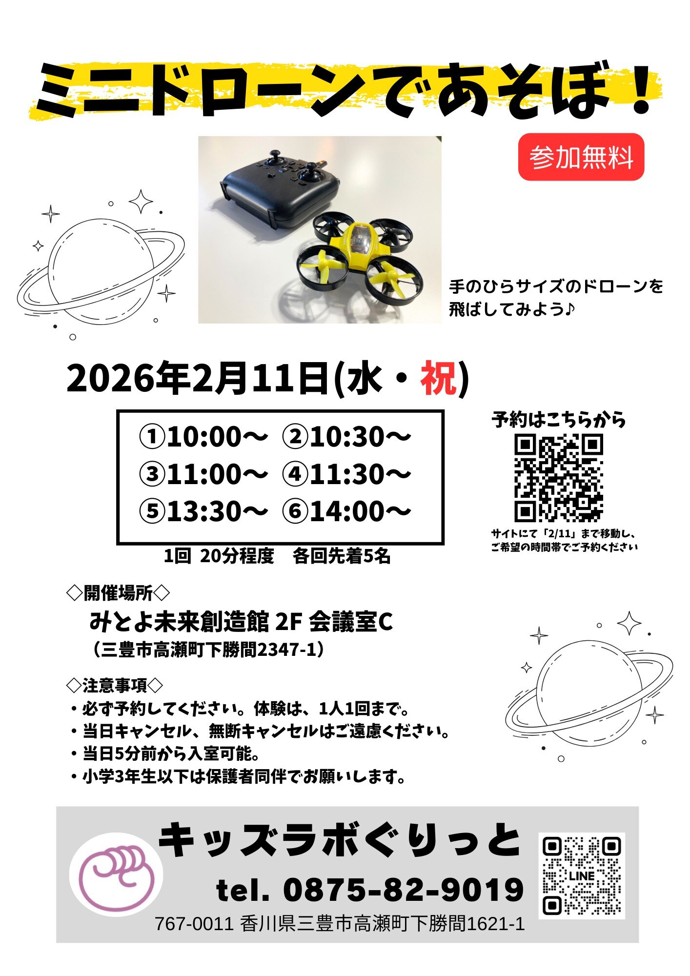 【キッズラボぐりっと】ミニドローンであそぼ! 2026年01月29日 | お知らせ 「キッズラボぐりっと」より、イベントのお知らせです。ご興味のある方は、チラシをご覧の上、直接お申し込みください。 facebook twitter line 最近の記事 【キッズラボぐりっと】ミニドローンであそぼ! 公益財団法人たかまつ讃岐てらす財団 「2025年度子ども若者の体験や学びの機会を支える助成」について 【ニオノチルビレッジ】子育てアップデートおしゃべり会について(12/9~3/10) 【NPO法人光かがやく絵顔の種】イベント中止について(11/28) 2026年度カゴメみらいやさい財団助成事業について ファミリーマート&むすびえ 2025年度 こども食堂スタート応援助成プログラム冬期スタートプラン募集について 公益社団法人セカンドハンド 2025年度子ども食堂助成金の募集について キューピーみらいたまご財団「2026年度 第Ⅰ期 助成事業募集」について ツルハグループ「こども食堂ゆたかさ基金」2026年度春期助成 募集開始について 令和7年度 赤い羽根「篠原欣子記念財団 こども食堂応援プログラム」香川県助成団体募集 バックナンバー 2026年 2025年 2024年 2023年 2022年 2021年 2020年 カテゴリー お知らせ イベント・交流会 助成金 一覧に戻る 過去の記事 »