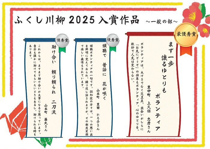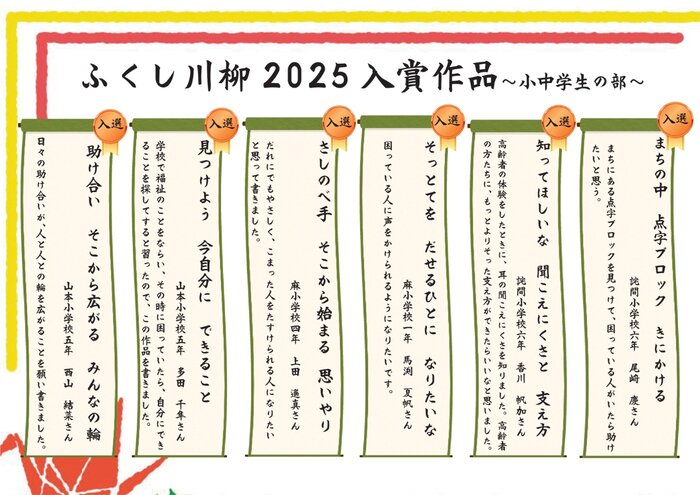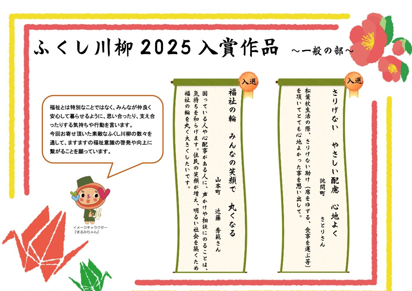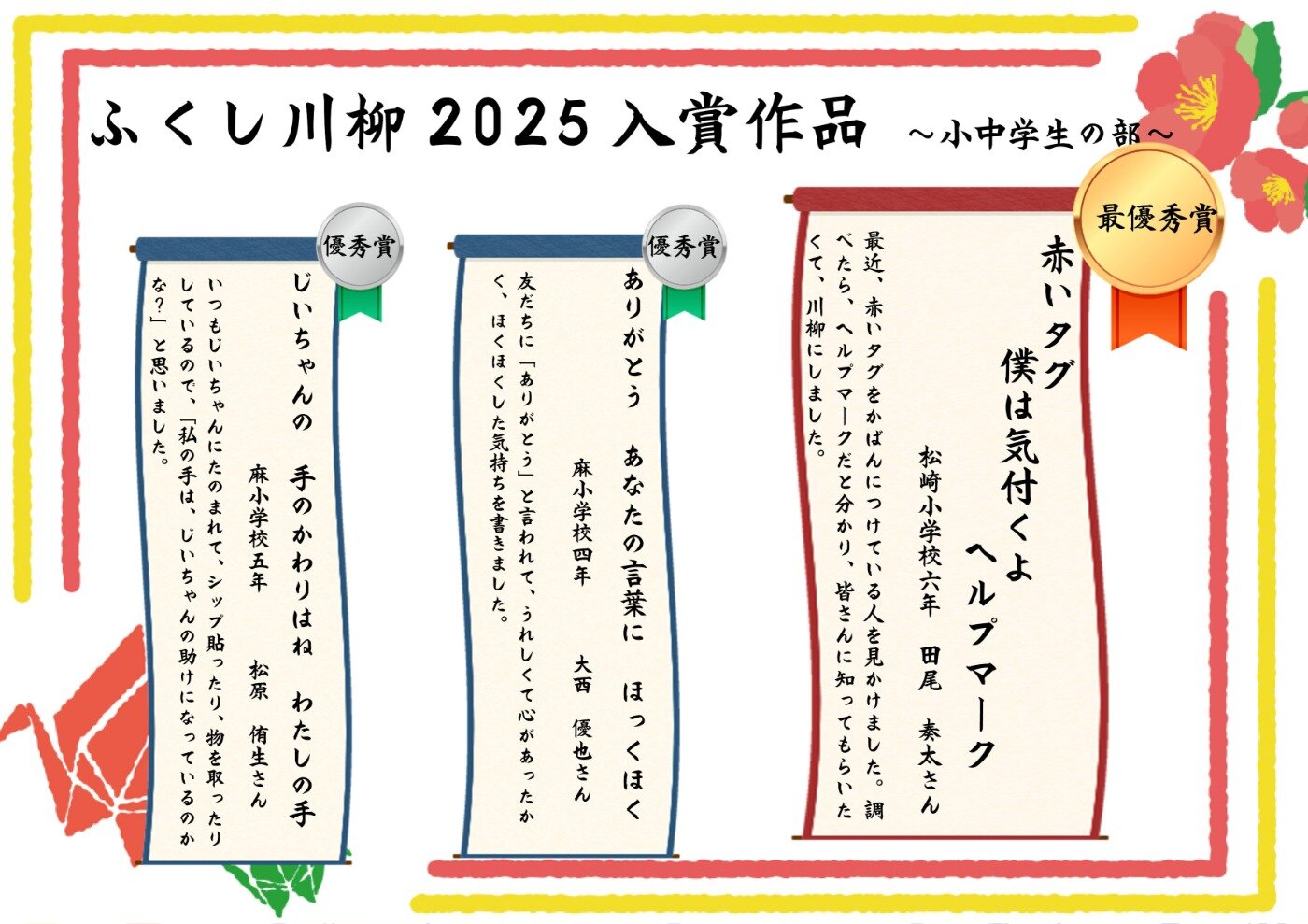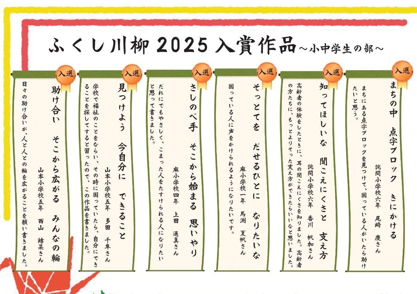 ふくし川柳2025 入賞作品発表 2025年12月09日 | お知らせ 今年度は320作品のご応募がありました。 今回、小学生の作品では、特に福祉体験を通じた作品が多く応募され、今まで以上に福祉の視点に立った作品が目を引きました。作品の中に、福祉の新しいキーワードが出てきたことで、福祉の啓発推進にも繋がるのではないかと感じます。また、人と人と関わりから生まれる支え合いの心や、日常の場面で私たちができる福祉についても、作品から考えることができました。たくさんのご応募、ありがとうございました。 それでは、入賞作品をご紹介します。 ふくし川柳入賞作品(小中学生の部) ふくし川柳入賞作品(一般の部) facebook twitter line